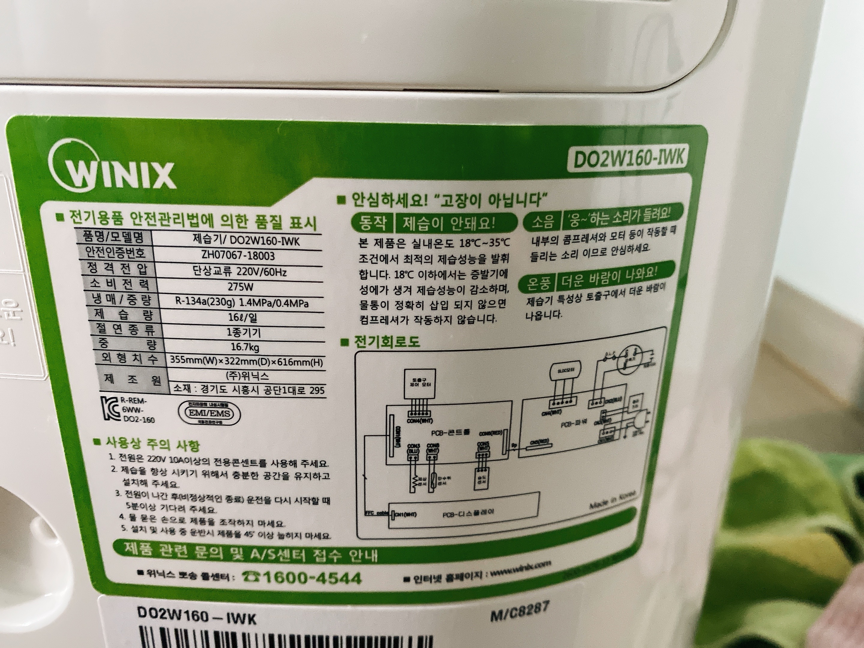 사용중인 제습기는 위니아 제습기인데, 제습성능이 하루에 16L 라고 하네요. ㅎ