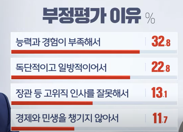 - 13% : 장관등 고위직 인사를 잘못해서 ( 장관 인사를 보면 할 말이 없긴 함.. )