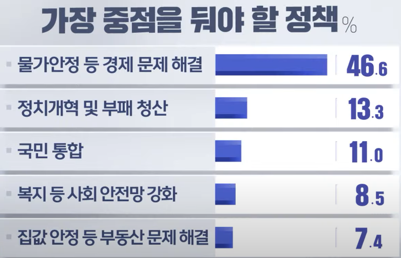 역시나 가장 기대하는건 민생안정이 압도적으로 높습니다. 괜히 전정권 털어서 되지도 않는 국정전환 하려고 하지말고, 제대로된 장관 인사를 통해서 안정적인 국정운영이 되길 기대해 봅니다.