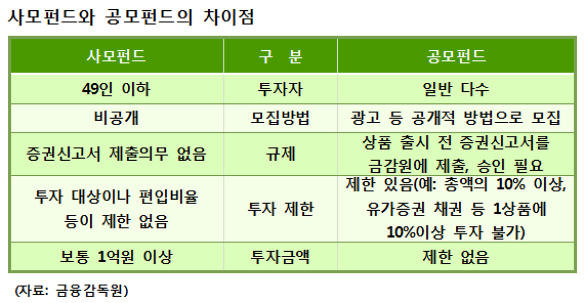 사모펀드(Private Placement Fund)는 ① 자본시장법상 공모 외의 방식(사모)으로 투자자를 모으는 펀드로서 ② 법령에서 정하는 전문투자자 등을 제외한 투자자의 수가 49인 이하로 제한된다. 사모펀드의 경우에는 공모펀드와 달리 투자자 보호를 위한 엄격한 규제가 면제되거나 완화되어 있다.