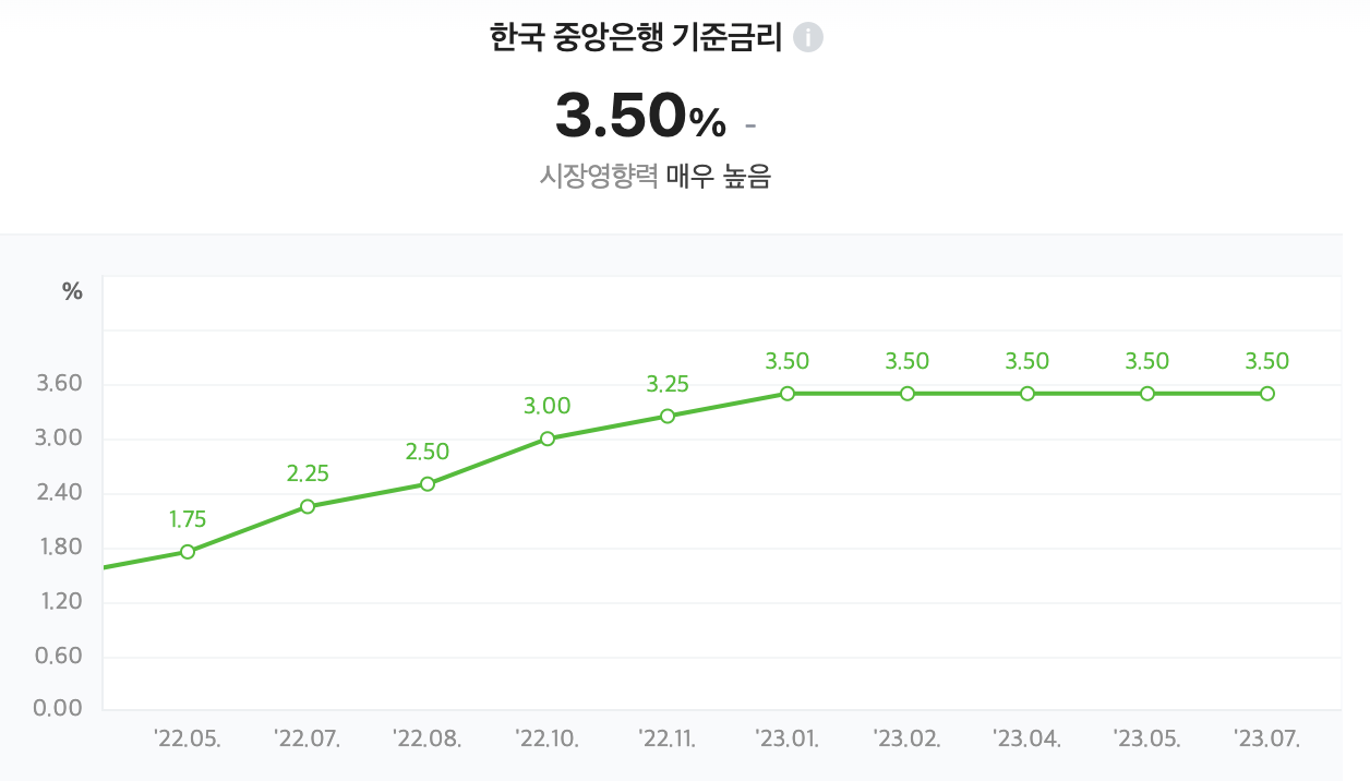 우리나라의 기준금리는 2023년 1월 3.50%으로 오른후에 6개월간 동결상태를 유지해서 현재도 기준 금리는 3.50% 입니다.