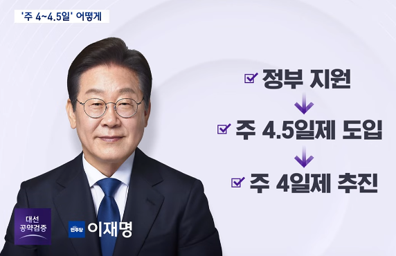이재명은 정부의 지원을 통해서 점진적인 방식으로 4.5일을 먼저 하고 이후 4일제로 진행한다는 방침입니다.