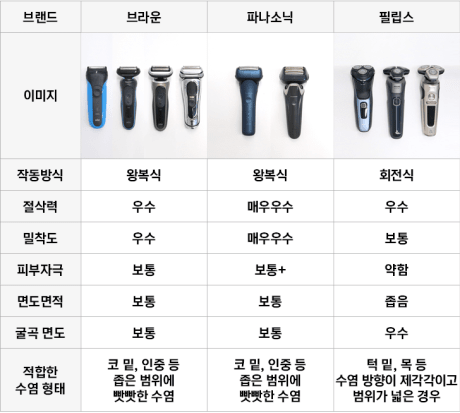 적응이 쉬운 왕복형(브라운/파나소닉) 밀착력이 가장 뛰어난 파나소닉 피부자극이 가장 덜한 필립스