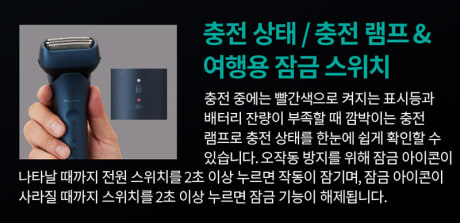 여행용 잠금 모드는 캐리어나 가방에서 면도기 버튼이 눌려 제멋대로 작동하는 것을 방지하는 기능입니다. 보통 전원 버튼을 길게 누르고 있으면 잠금이 걸립니다.