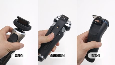 트리머는 면도기 헤드를 교체하는 방식과 밀어 올려 사용하는 슬라이드식, 버튼을 눌러 튀어 오르게 해 사용하는 팝업식으로 구분됩니다.