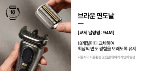 브라운의 면도날 교체 주기는 18개월입니다. 브라운은 면도기 날망이 모두 일체형이기 때문에 한 번에 교체하면 됩니다.